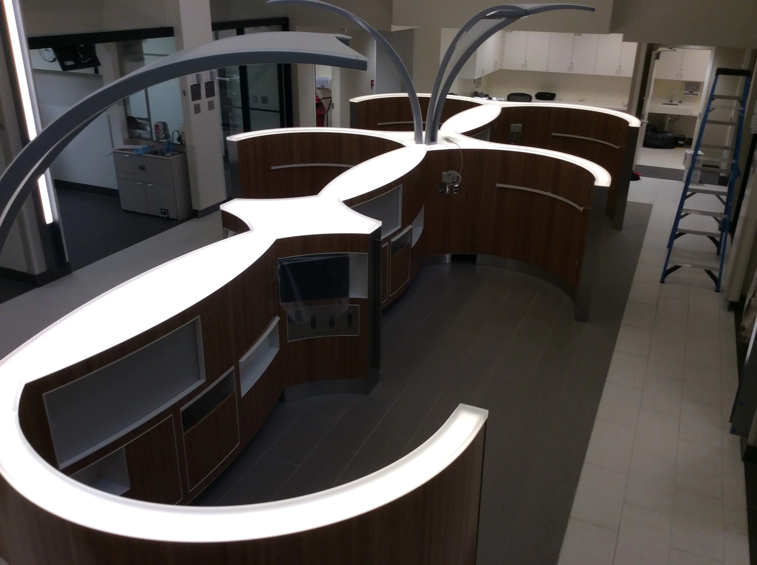 Our Custom Critical Millwork team was called upon to bring Cedar Sinai Hospital's vision of creating innovative and architecturally stunning "Infusion Pods" for patients receiving their medical infusions. These "pods" are built on a curved aluminum frame, featuring canopies with integrated lighting and medical devices required for the infusion process integrated into each station. The design team at Cedar Sinai Hospital created a revolutionary way to fuse the needs of medical professionals with the patient experience.
