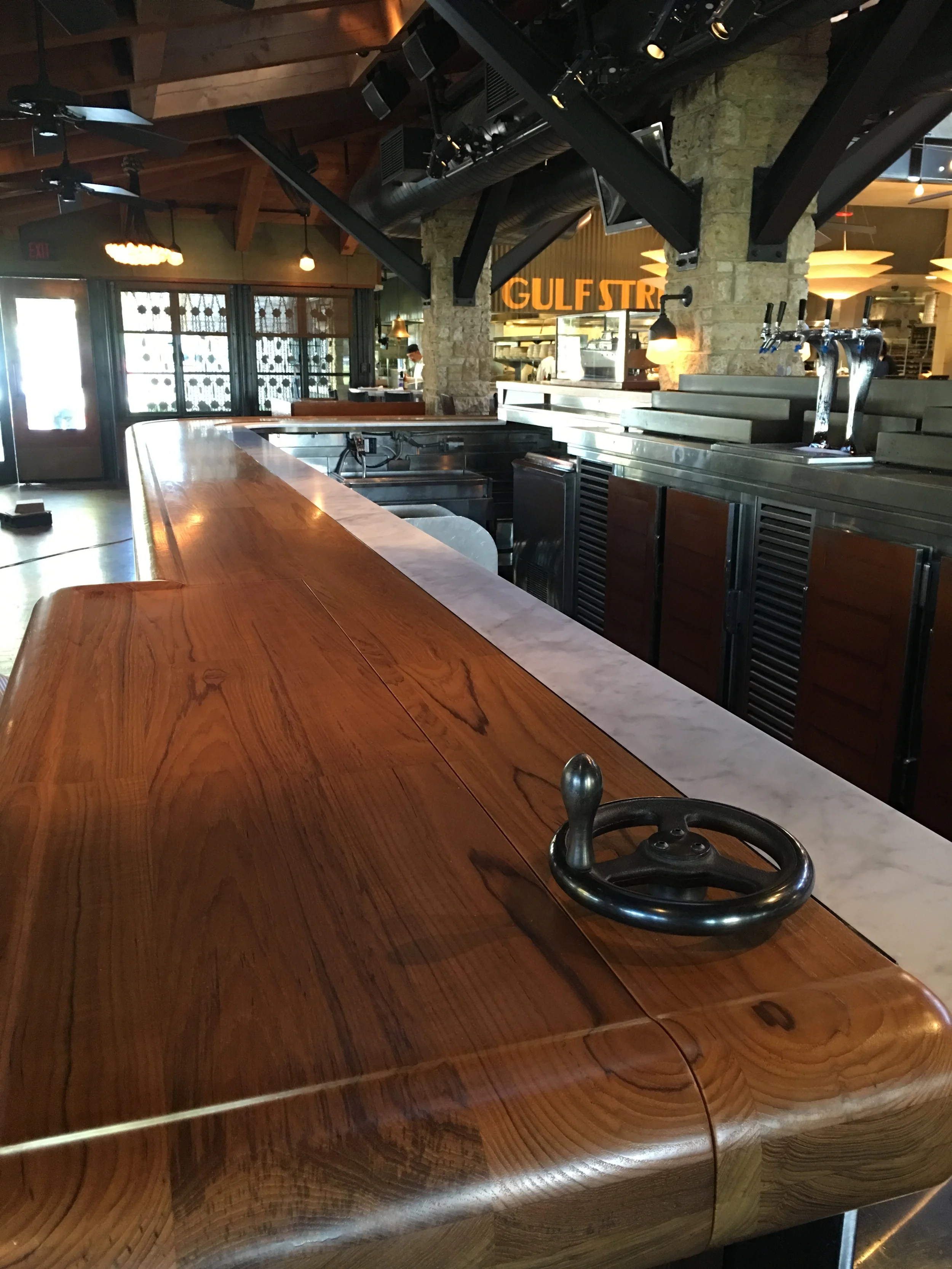 The design team at The Hillstone Restuarant Group asked us to manufacture and install a new solid stock teak bar assembly with an integrated bull nose (one piece) at their Gulfsteam Restaurant in Corona del Mar. This was carved out on our 5 Axis CNC Router and delivered as one piece to the restaurant. Another unique feature to check out while you are there eating their famous oysters is the ADA compliant area at the end of the bar. We installed a lift system to allow this section of the bar to be lowered.