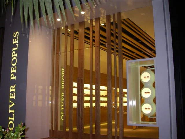 We manufactured and installed the "millwork package" at the Fashion Valley Oliver People's Boutique in San Diego. This included; Ash Veneer displays, drawer assemblies, display shelving with integrated light pockets, cabinets, stainless steel and mirror clad boxes, custom listening station with integrated shelves, iPod holder box and hooks for headphones, cash wrap assembly and the lineal wood ceiling treatment.